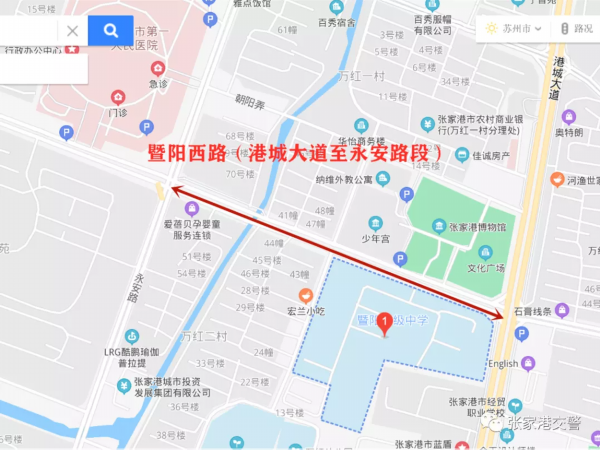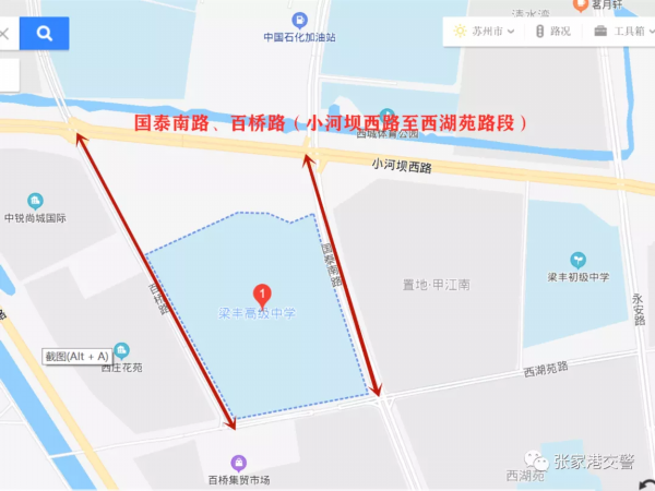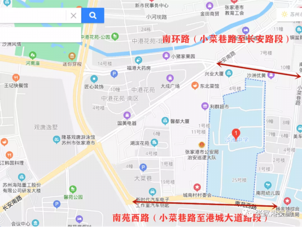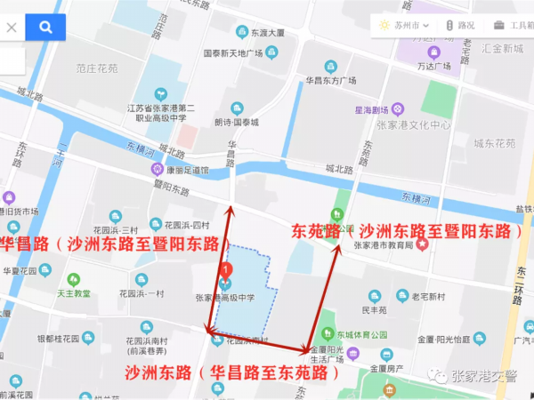张家港高级中学:沙洲东路(华昌路至东苑路)、华昌路(沙洲东路至暨阳东路)、东苑路(沙洲东路至暨阳东路)