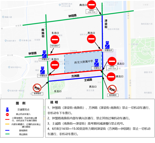 2、二级管控区:钟慧路南施街内部车辆允许通行,禁止过路机动车通行。士诚路(南施街—津梁街)高考期间车辆行经减速慢行,禁止鸣笛。6月8日14:50—15:30英语听力期间津梁街(方洲路—钟园路)禁止一切机动车通行,非机动车下车推行。