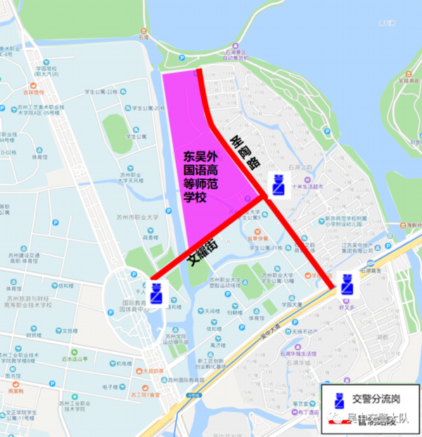 为了给考生们考试营造安全、畅通、有序的交通环境,苏州交警精心准备、提前赶赴相应考点,对周边道路进行实地安排部署。
