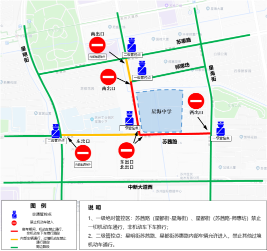 1、一级绝对管控区:苏茜路(星都街—星海街)、星都街(苏茜路—师惠坊)禁止一切机动车通行,非机动车下车推行;