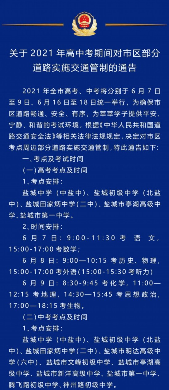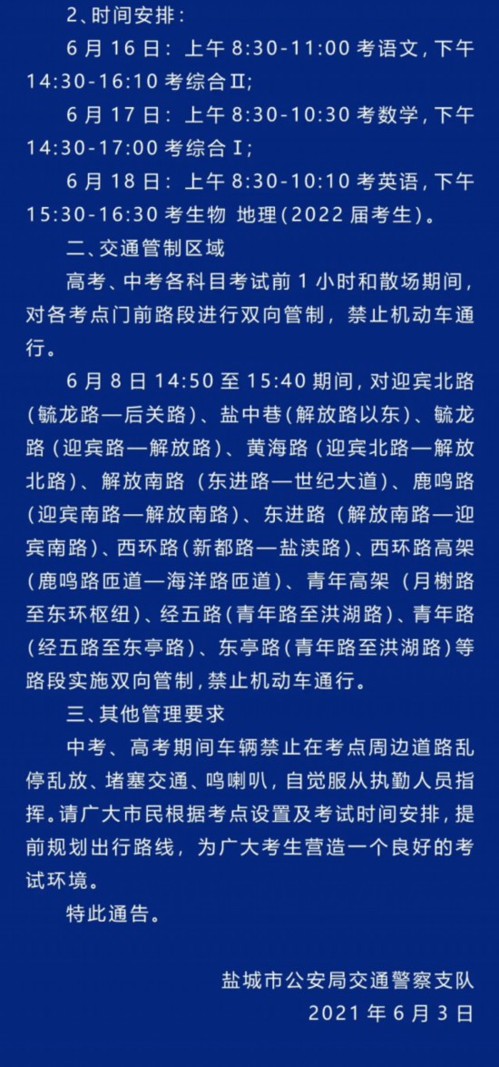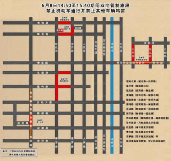 6月8日14:50至15:40期间,对迎宾北路(毓龙路—后关路)、盐中巷(解放路以东)、毓龙路(迎宾路—解放路)、黄海路(迎宾北路—解放北路)、解放南路(东进路—世纪大道)、鹿鸣路(迎宾南路—解放南路)、东进路(解放南路—迎宾南路)、西环路(新都路—盐渎路)、西环路高架(鹿鸣路匝道—海洋路匝道)、青年高架(月榭路至东环枢纽)、经五路(青年路至洪湖路)、青年路(经五路至东亭路)、东亭路(青年路至洪湖路)等路段实施双向管制,禁止机动车通行。