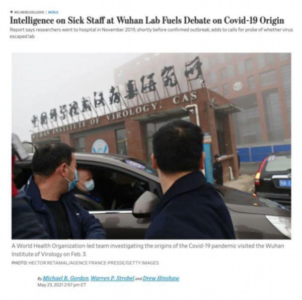 5 月 23 日,《华尔街日报》援引 " 情报部门报告 " 称,早在 2019 年底,武汉病毒研究所就有 3 名研究人员出现身体不适并就医的情况,暗示 " 病毒是从实验室泄露出去的 "。