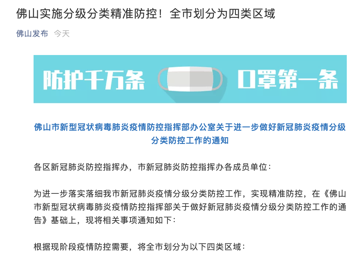 荔枝新闻讯 据佛山发布微信公众号消息,佛山市新型冠状病毒肺炎疫情防控指挥部办公室发布关于进一步做好新冠肺炎疫情分级分类防控工作的通知,具体内容如下: