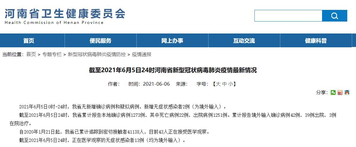 截至2021年6月5日24时,河南省累计报告本地确诊病例1273例,其中死亡病例22例,出院病例1251例。累计报告境外输入确诊病例42例,39例出院,3例在院治疗。