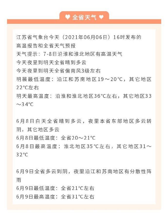 7-8日沿淮和淮北地区有高温天气,最高可达36℃左右,9日白天全省多云,夜里沿江和苏南地区有分散性雷阵雨,其他地区多云到阴。今天夜里到明天全省晴到多云,今天夜里到明天全省偏南风3级左右,明晨最低温度:沿江和苏南地区19~20℃,其它地区22℃左右,明天最高温度:沿淮和淮北地区36℃左右,其它地区33~34℃。