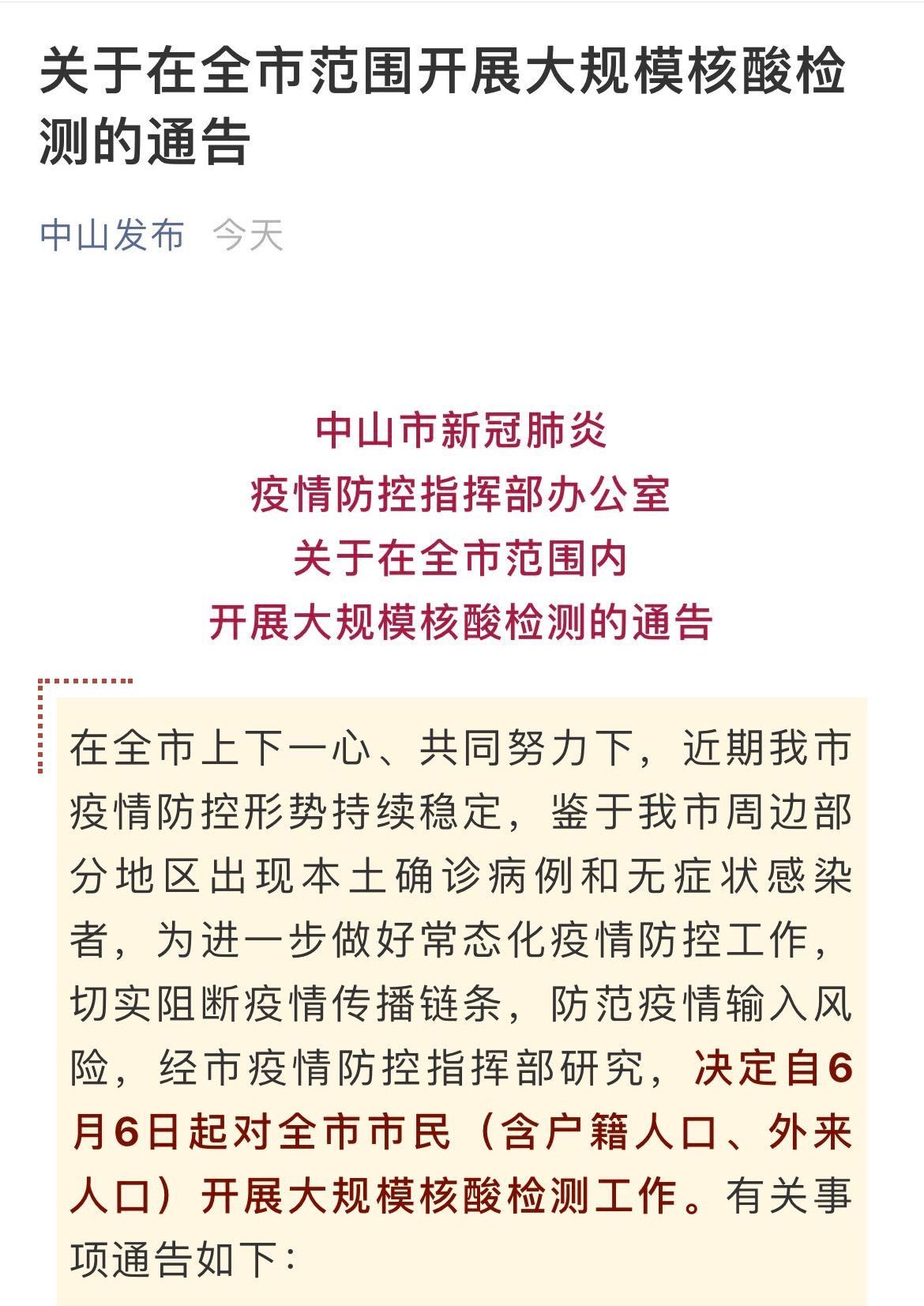 荔枝新闻讯 据微信公众号“中山发布”消息,经中山市疫情防控指挥部研究,决定自6月6日起对全市市民(含户籍人口、外来人口)开展大规模核酸检测工作。有关事项通告如下: