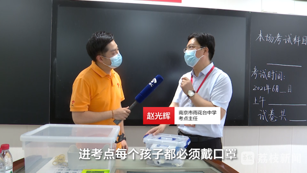南京市雨花台中学考点主任赵光辉告诉记者,“考生先在门外,接受一个金属探测器的探测,看有没有带违禁物品,进到考场后用考务通系统,去验证身份。进入考点,每个孩子都必须戴口罩,进考场以后,戴不戴口罩自行决定。我们早晨很早就会把空调打开,全天空调都是开着的。”