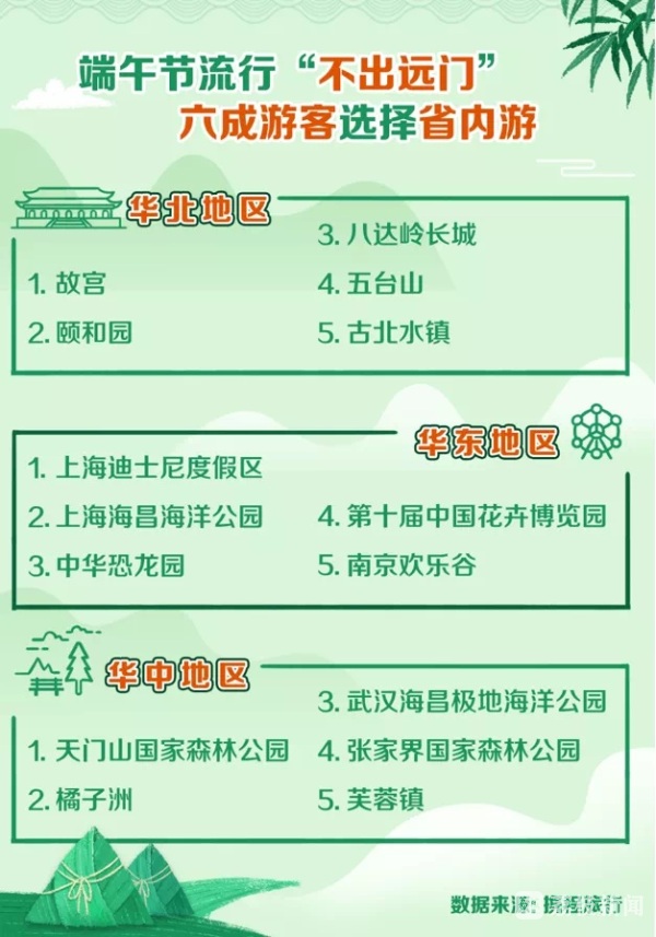 根据携程数据显示,截至6月2号,通过携程预订的旅游订单量同比增长135%,预计今年端午假期出游人次将达1亿,消费者主要以中短途出游为主。数据显示,北京、上海、杭州、成都、南京、重庆、长沙、深圳、青岛、西安位列端午假期最热门目的地前十名。其中,北京故宫、颐和园,上海迪士尼度假区,南京欢乐谷,成都大熊猫繁育研究基地,西安秦始皇帝陵博物院等景区最为热门。