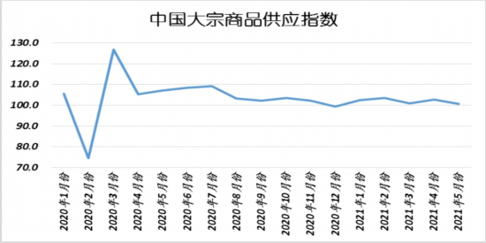 2021年5月份,大宗商品供应指数较上月回落2.1个百分点,至100.6%,指数跌至近五个月内的最低。从各主要商品情况来看,生产利润仍是左右商品供应的重要因素,本月钢铁、有色金属等商品供应量继续保持增长态势,但煤炭、汽车等商品受制于原料供应、进口减少等因素,出现供应减少的局面。