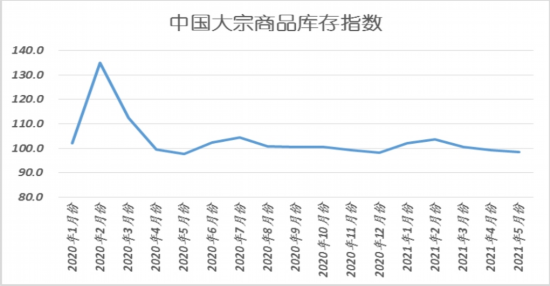 2021年5月份,大宗商品库存指数连续三个月下降,本月跌至98.4%,较上月下降0.7个百分点。显示当前市场供需较为均衡,商品“去库存化”得到延续,商品库存压力持续缓解。各主要商品中,钢铁、铁矿石、煤炭、成品油、有色金属和化工库存量均较上月有所减少;汽车库存量虽有所增加,但增速出现减缓。
