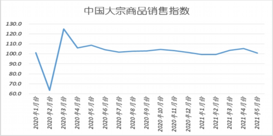 2021年5月份,大宗商品销售指数为100.8%,较上月回落4.7个百分点,销售增速明显减缓。从市场情况来看,近期随着南方陆续进入梅雨季节,终端需求开始逐渐放缓,1-4月份房地产市场增速较1-3月份略有减速,后市继续大增动能稍显不足,加上近期宏观政策依然对房地产市场持收紧态势,短期对大宗商品市场的支撑或有减弱;“缺芯”问题对企业生产影响将持续较长时间,汽车行业的需求也将有所收紧。不过,本月销售指数大幅回落,我们认为一方面是前期需求端增长较快,基数较高;另一方面是近期商品价格波动较大,引起部分终端需求进入观望阶段,随着价格回归合理,前期被积压的需求或有一定释放。从各主要商品来看,本月钢铁、铁矿石和汽车销售量均出现下降格局,煤炭、成品油、有色金属和化工销售量虽较上月有所增加,但增速均有不同程度的减缓。