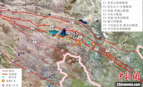 中新网记者7日从青海省地质调查院获悉,青海省玛多县7.4级地震共调查出活动断裂6条、地裂缝653条,且地裂缝总体呈北西-南东向展布。
