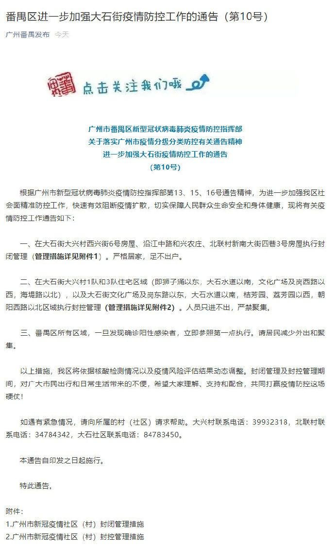 荔枝新闻讯 据中国共产党广州市番禺区委员会宣传部微信公众号“广州番禺发布”6月7日消息,广州市番禺区新型冠状病毒肺炎疫情防控指挥部发布进一步加强大石街疫情防控工作的通告(第10号) 。