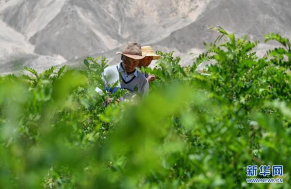 在山南市雅鲁藏布江河谷地带,村民们在维护固沙用的草方格(2019年7月14日摄)。新华社发(资料照片)