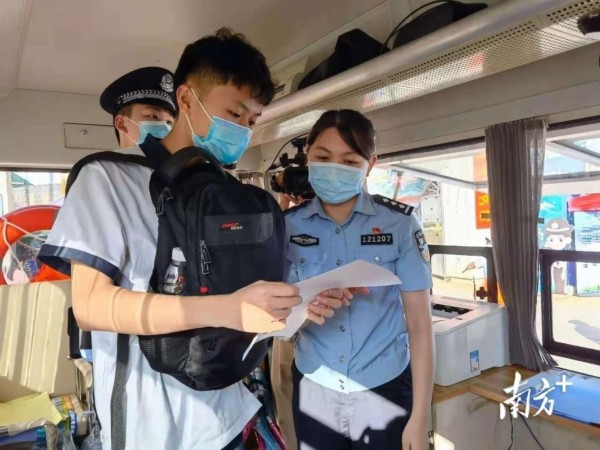 高考首日,在梅州梅县区高级中学考点,昨天中午发现身份证遗失的考生小曾,听老师说考点外的移动警务车可以办理临时身份证明,一早就来到来移动警务车补办。不到3分钟,便从民警手中拿到了证明。“谢谢你们,我会加油的!”小曾向民警鞠了一躬,便大步向考场走去。