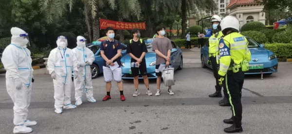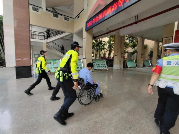 6月7日,东莞交警东城大队护考警力提前到岗,对考场周边路段加强巡逻管控,全力为考生提供良好有序的道路交通环境。7时35分许,安保警力在光明中学考点发现一名行动不便的考生,原来该考生早前脚受伤,今天高考,担心时间仓促,所以提前回考场。执勤人员获悉情况后,为让考生有充裕的时间应对考试,主动护送该考生到达教学楼,并同心协力把该考生抬上楼,安全护送到考场外面,让其能安心准备考试。