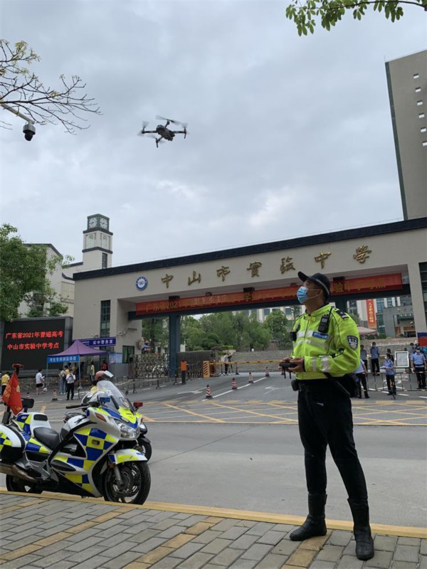 中山公安交警支队派出配备大疆无人机的铁骑,开展空地一体空中巡逻管控,全面加强考场周边道路路况感知,及时发现并处置突发交通事件,并将现场画面实时回传指挥中心,强化指挥调度,全力保障考场周边道路畅通有序。