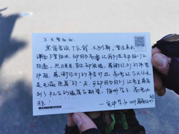 在梅州东山中学考场,一考生在入考场前向铁骑骑手赠送明信片