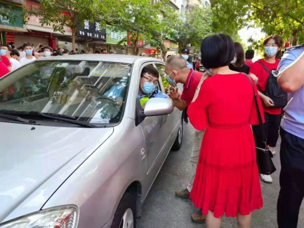 在茂名,第十六中有一名监考老师迟到了,把车直接开到考场旁边,丢下车就跑进考场了,茂名公安执勤民警帮她把车开到指定停车场放好。