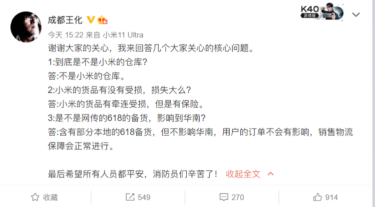 6月7日下午,针对网传谣言小米集团公关部总经理王化在社交媒体上回应称,不是小米仓库,小米货品有牵连受损,但有保险。用户订单不会有影响,销售物流保障会正常进行。