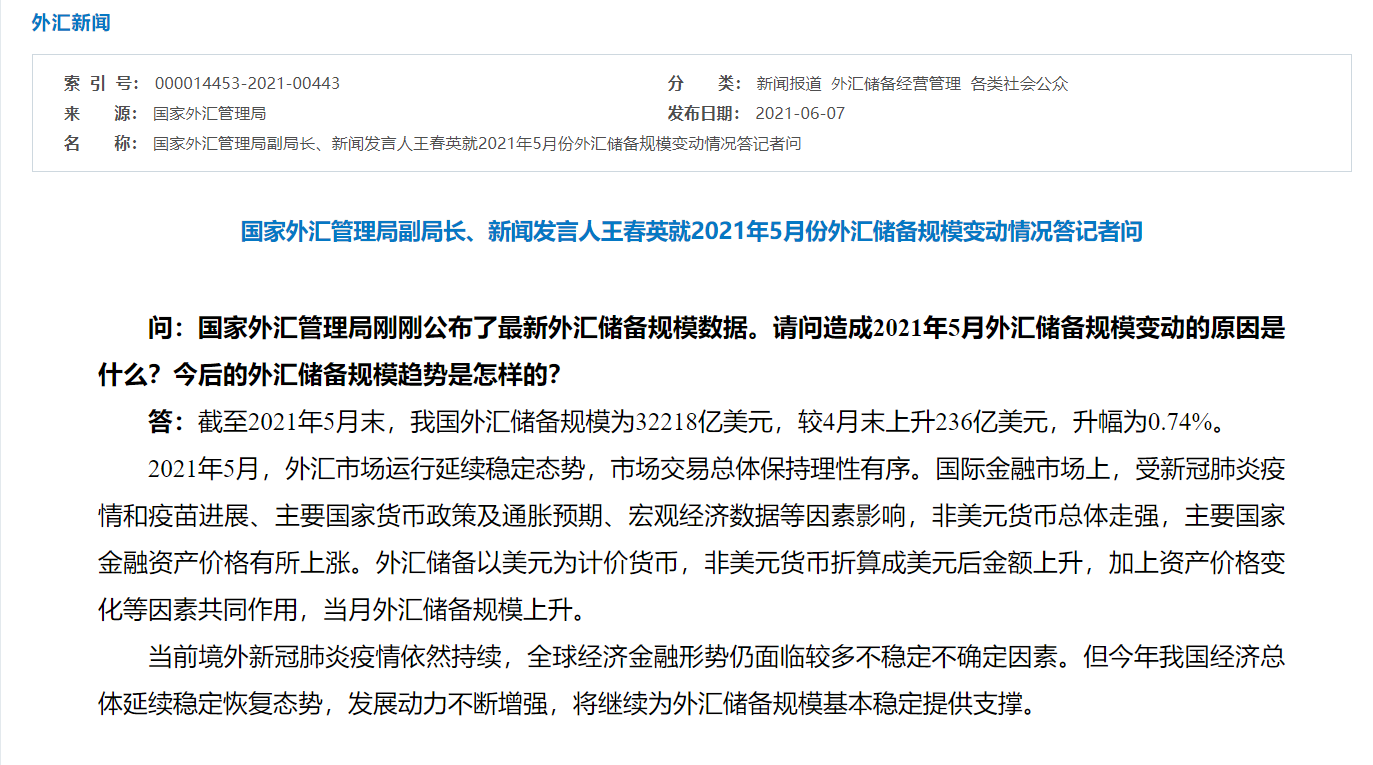 据国家外汇管理局网站7日消息,国家外汇管理局副局长、新闻发言人王春英在答记者问时表示,截至2021年5月末,我国外汇储备规模为32218亿美元,较4月末上升236亿美元,升幅为0.74%。