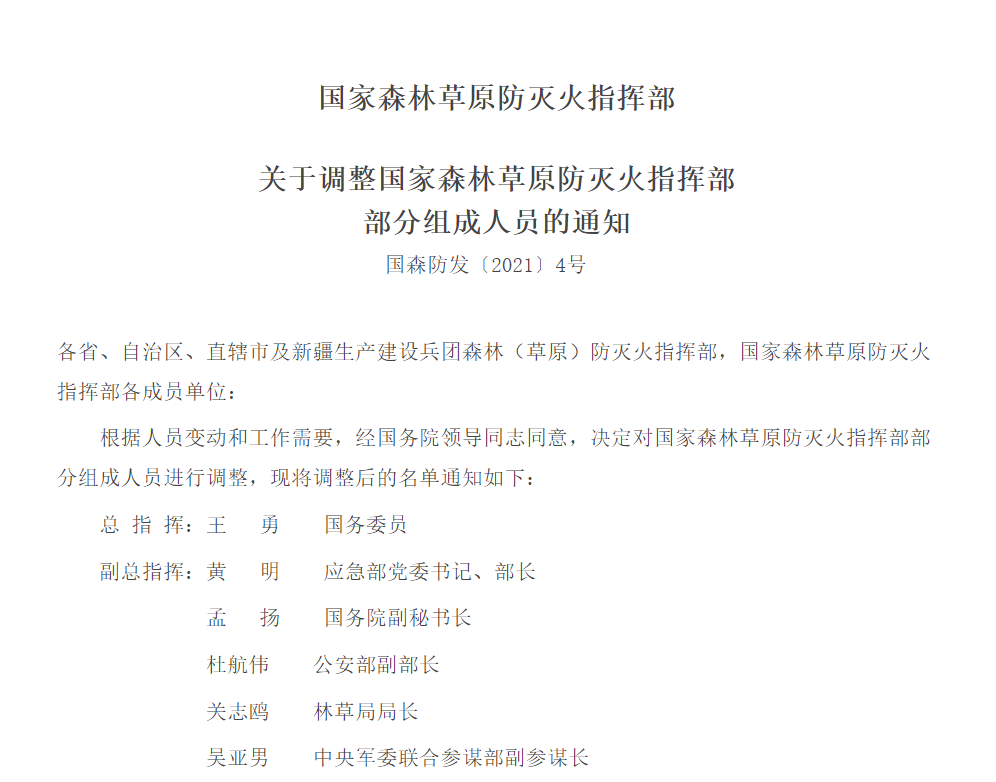 据国家应急管理部网站6月7日消息,国家森林草原防灭火指挥部发布关于调整国家森林草原防灭火指挥部部分组成人员的通知。调整后的名单通知如下: