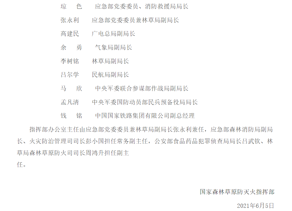 指挥部办公室主任由应急部党委委员兼林草局副局长张永利兼任,应急部森林消防局副局长、火灾防治管理司司长彭小国担任常务副主任,公安部食品药品犯罪侦查局局长吕武钦、林草局森林草原防火司司长周鸿升担任副主任。