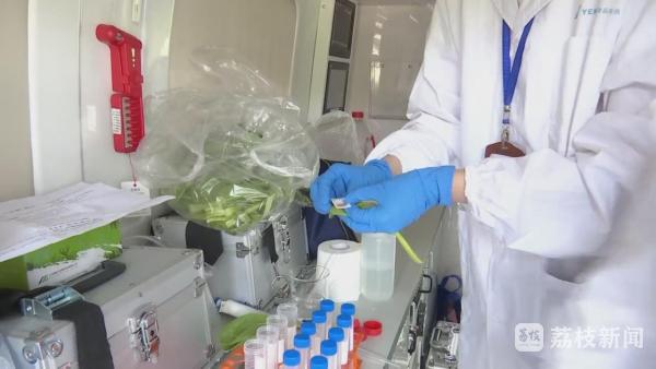 同时,在食堂外,工作人员运用专业技术对食品原料进行随机抽查检测。