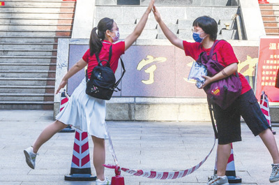 广西南宁市第二中学新民校区考点,老师(左)与考生击掌。