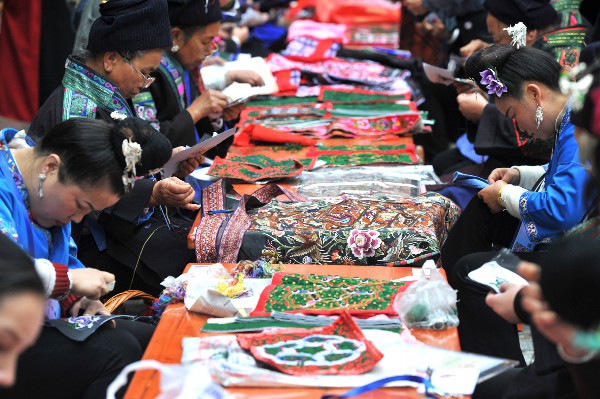 △2021年4月25日,贵州黔东南,200余名绣娘在苗绣技能大赛中飞针走线。