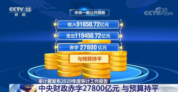 审计报告指出,2020年中央预算执行情况总体较好。中央一般公共预算收入91650.72亿元,支出119450.72亿元,赤字27800亿元,与预算持平。国家发展改革委组织分配中央财政投资6000亿元,其中安排中央本级支出930亿元、对地方转移支付5070亿元。