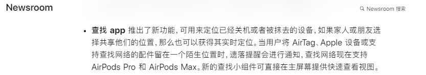 荔枝新闻讯 据苹果官网发布消息,苹果在WWDC2021发布了iOS 15系统,其中查找 app 推出了新功能,可用来定位已经关机或者被抹去的设备,如果家人或朋友选择共享他们的位置,那么也可以获得其实时定位。当用户将 AirTag、Apple 设备或支持查找网络的配件留在一个陌生位置时,遗落提醒会进行通知,查找网络现在支持 AirPods Pro 和 AirPods Max。新的查找小组件可直接在主屏幕提供快速查看视图。