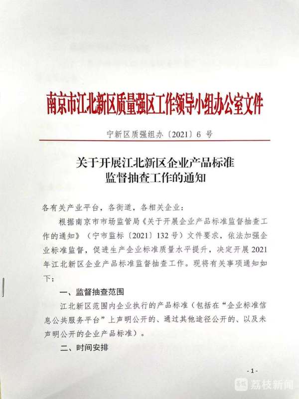 为依法加强企业标准监督,促进新区生产企业标准质量水平提升,5月下旬,江北新区市场监管局印发《关于开展江北新区企业产品标准监督抽查工作的通知》,要求各有关产业平台,各街道从6月1日起开展2021年企业产品标准监督抽查工作。