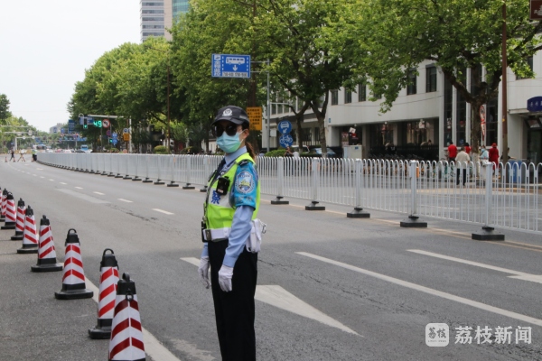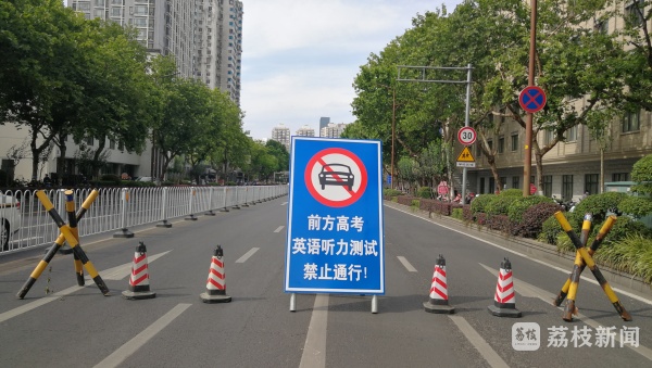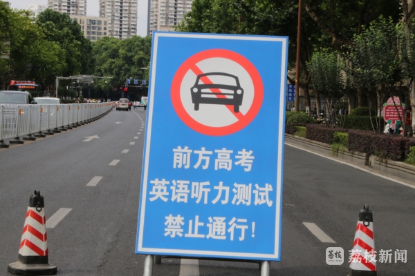“英语听力考试马上就要开始了,过往车辆请绕行。”6月8日下午2点50分,笔者在南京一中考点看到,周边的交叉路口全部进入“禁鸣禁行”模式,数十名交警一边指挥过往车辆绕行,一边在十字路口摆放上禁行标识。
