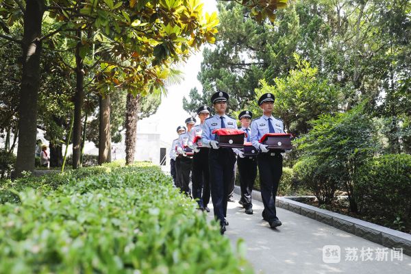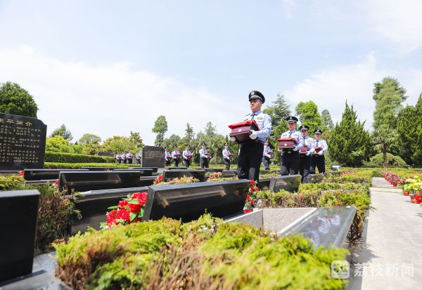 初夏时节,三仓烈士陵园松柏苍翠,草木葱茏,显得分外庄严肃穆。纪念碑上,陈毅元帅书写的“立德立功,永垂不朽”八个大字在阳光下熠熠生辉。纪念碑前,悬挂着“弘扬英烈精神,传承红色基因”“功业常齐天地永,红旗自有后人擎”两幅标语。 上午10点,安葬仪式开始,伴随着荡气回肠的《思念曲》,36名公安干警缓缓步入,护送覆盖国旗的烈士棺椁至烈士纪念碑前,放置于灵台上,全体人员肃立向烈士棺椁三鞠躬。随后,烈士棺椁移至安葬区,参加仪式的人员走到墓碑前向烈士敬献鲜花。