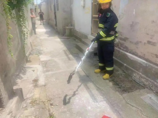 当天上午10点左右,溱潼镇曙光巷一户人家也出现了大蛇。姜堰区消防救援大队溱潼专职队消防员赶到现场,得知大蛇已经逃窜到巷内的阴沟里。