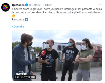 而就在袭击事件发生前不久,报道说,在法国电视节目《每日新闻》(Quotidien)节目拍摄的画面中,达米安和亚瑟宁和第三位男子还一起接受了媒体采访。第三位男子当时对媒体说,针对“法国的衰落”,他“有话要对国家元首说”,因为总统“说我们没有文化”。但在他身边的达米恩和亚瑟宁没有说话。↓