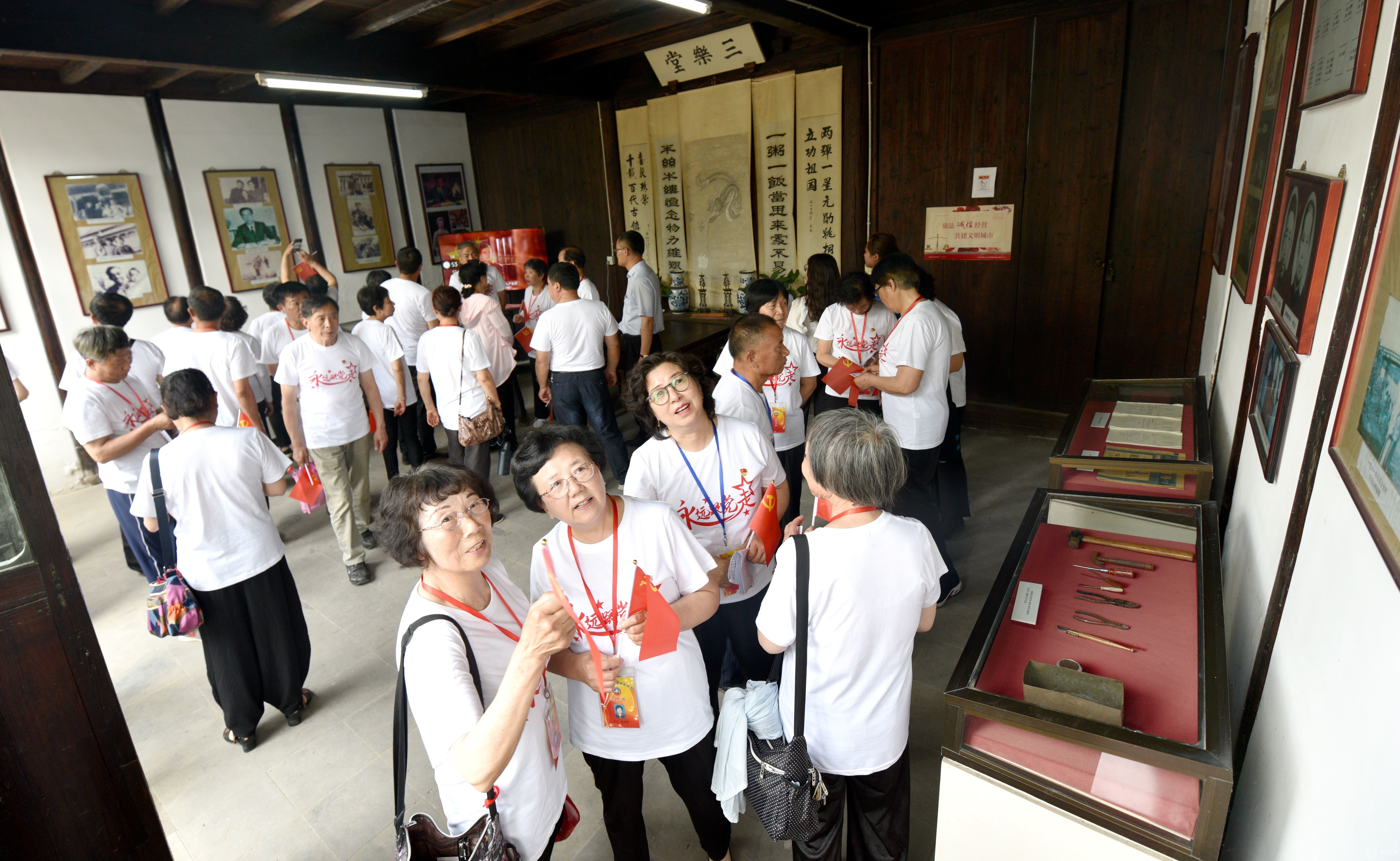 在新四军六师师部广场,全体人员朗诵陈毅诗词《梅林三章》、毛泽东七律长征等革命诗词、全体党员重温入党誓词;在姚桐斌故居,锡山区老年人体协敬献了花篮,全体人员向姚桐斌铜像三鞠躬,进行了“没有共产党就没有新中国”的大合唱,高吭的歌声响彻姚桐斌故居。