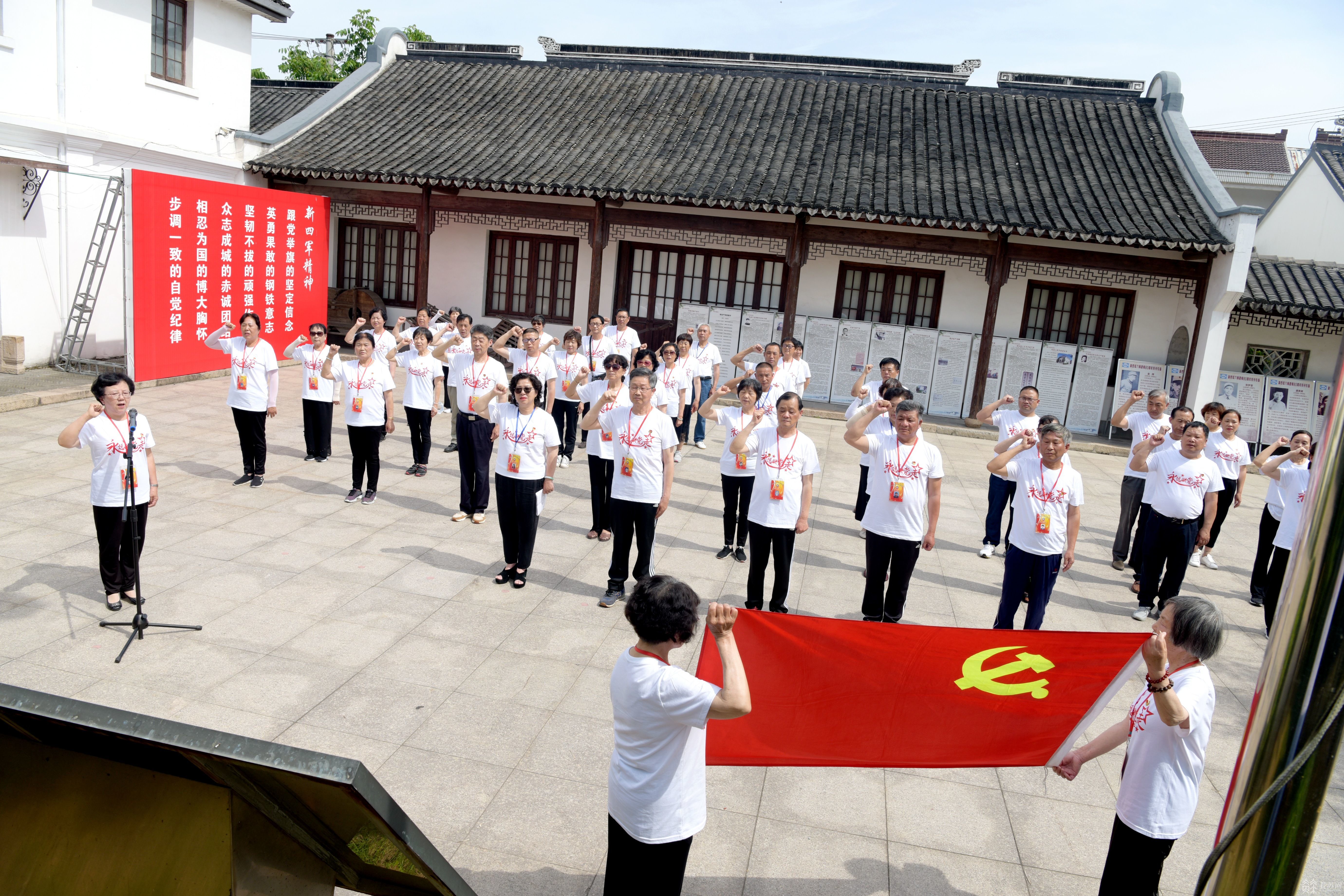 锡山区老年人体协执行会长在致词中说道:一个世纪以来,从上海石库门出发,自嘉兴南湖起航,走过赣水闽山的蜿蜒小道,跨过万里长征的雪山草地,迈过沟壑纵横的黄土高坡,渡过浩浩荡荡的长江天堑。中国共产党带领亿万人民,在付出巨大牺牲后,终于赢得了民族的独立和解放。在党的英明领导下,经几代人的艰苦奋斗,我们的祖国终于站了起来,富了起来,并正日益强盛起来。锡山是革命老区,我们脚下的每一方土地都是革命英烈用献血染红的。大革命时期,出生在锡北寨门的共产党员严朴“毁家闹革命”,领导了轰轰烈烈的秋收起义,播下了革命的火种。抗战时期,在陈毅的指挥下,叶飞、谭震林先后带领新四军东进抗日,在黄土塘打响了东进抗日的第一战。新四军六师师部就设在寨门诸巷。为有牺牲多壮志,敢教日月换新天。今天我们来到革命先烈浴血战斗过的地方,就是要缅怀他们的光辉业绩,赓续共产党人的精神血脉,点亮心中的理想信念之光,让我们“银发一族”传承红色基因,践行初心使命,在为老服务的新征程上,焕发出晚霞更绚丽的光彩!