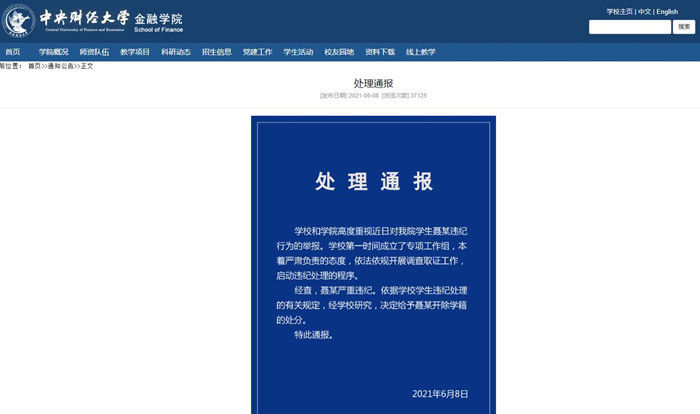 荔枝新闻讯 中央财经大学金融学院网站6月8日发布处理通报称,学校和学院高度重视近日对我院学生聂某违纪行为的举报。学校第一时间成立了专项工作组,本着严肃负责的态度,依法依规开展调查取证工作,启动违纪处理的程序。