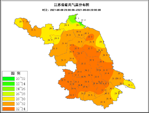 最高气温出现在江都34.2℃