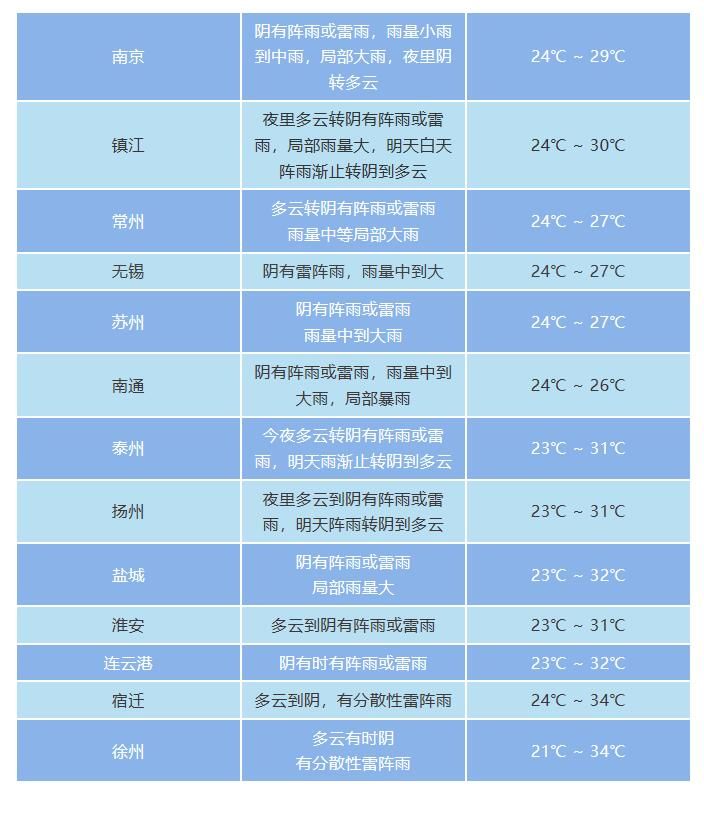 受雨水影响,沿江苏南明天最高气温普遍降至30℃以下,明天上班出门记得带伞,大风期间注意安全哦!