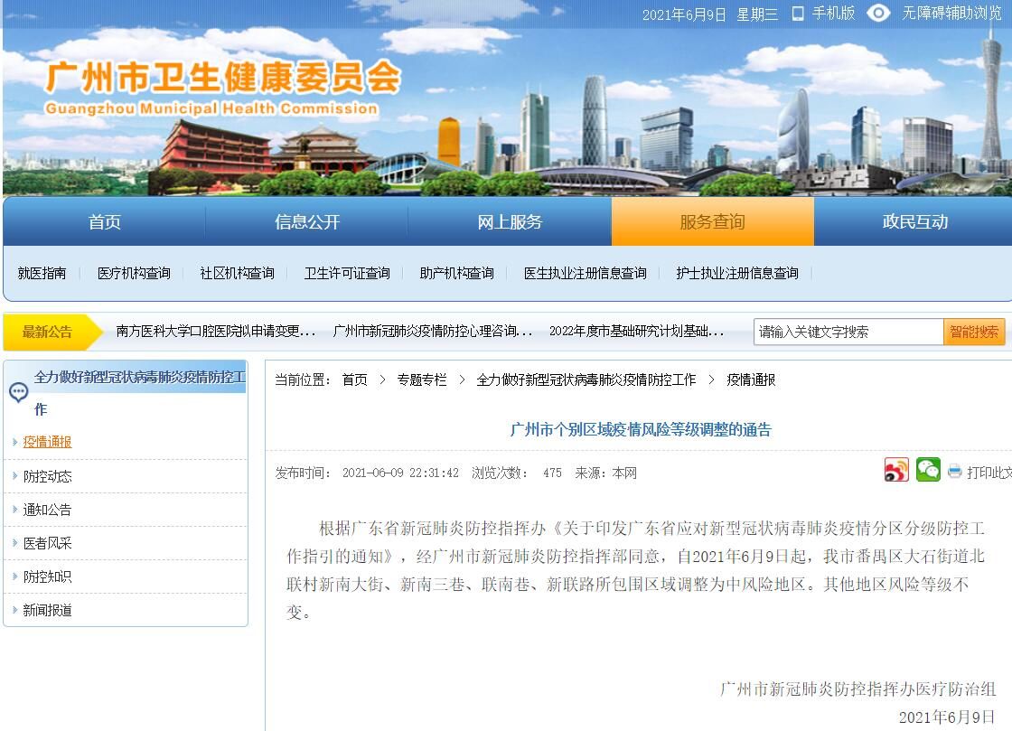 荔枝新闻讯 据广州卫健委网站消息,根据广东省新冠肺炎防控指挥办《关于印发广东省应对新型冠状病毒肺炎疫情分区分级防控工作指引的通知》,经广州市新冠肺炎防控指挥部同意,自2021年6月9日起,广州市番禺区大石街道北联村新南大街、新南三巷、联南巷、新联路所包围区域调整为中风险地区。其他地区风险等级不变。