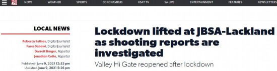 美国圣安东尼奥-拉克兰联合基地当地时间6月9日疑似发生枪击事件,基地随后被封锁。据美国KSAT电视台消息,该基地已于当地时间9日14时30分左右完全解除封锁。