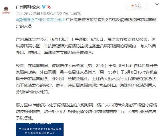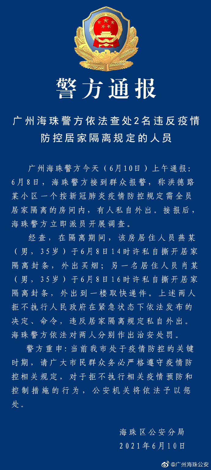 荔枝新闻讯 据广州市公安局海珠区分局官方微博@广州海珠公安 消息,广州海珠警方今天(6月10日)上午通报:6月8日,海珠警方接到群众报警,称洪德路某小区一个按新冠肺炎疫情防控规定需全员居家隔离的房间内,有人私自外出。接报后,海珠警方立即派员开展调查。