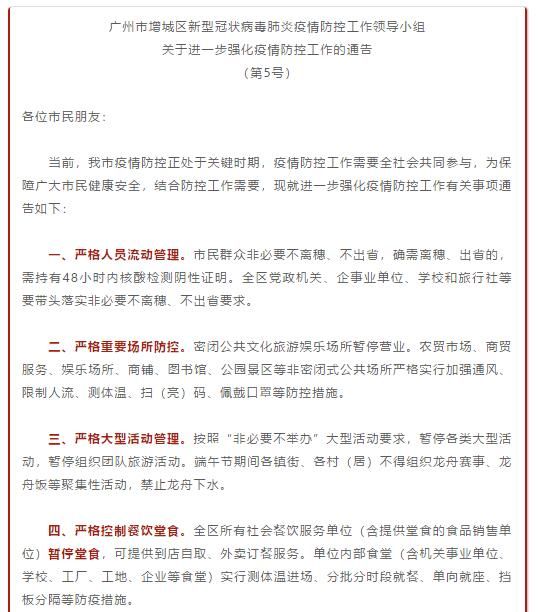 一、严格人员流动管理。市民群众非必要不离穗、不出省,确需离穗、出省的,需持有48小时内核酸检测阴性证明。全区党政机关、企事业单位、学校和旅行社等要带头落实非必要不离穗、不出省要求。