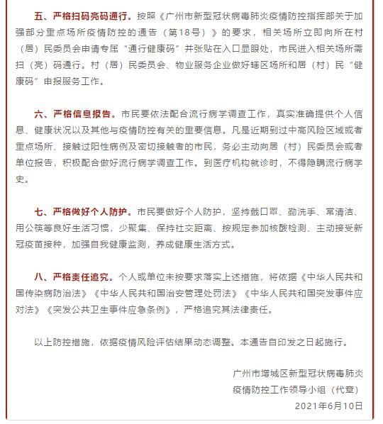 荔枝新闻讯 据中国共产党广州市增城区委员会宣传部微信公众号“广州增城发布”6月10日消息,广州市增城区新型冠状病毒肺炎疫情防控工作领导小组发布关于进一步强化疫情防控工作的通告(第5号),其中要求增城全区所有社会餐饮服务单位(含提供堂食的食品销售单位)暂停堂食,市民进入相关场所需扫(亮)码通行。全文如下: