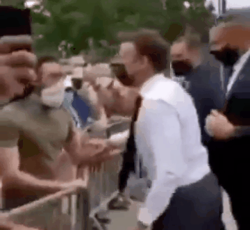 从一所酒店管理院校走出后,只见马克龙一路小跑,奔向等候在一旁的民众。就当马克龙一派和气地与民众打招呼时,面前一位穿着绿色T恤、长发飘飘的男子,一只手抓住马克龙的手臂,另一只手突然朝着马克龙的脸就扇了过去,视频中能清晰听到“啪”的一声。