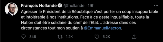 法国前总统奥朗德表示,这一记耳光是“对我们制度无法忍受的打击……整个国家必须与国家元首团结一致”。