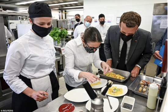 6月8日当天,马克龙刚刚参观完该城的一家酒店管理学校,为餐饮业的重启加油打气。照片上能看到,马克龙似乎还在厨房交流做菜。